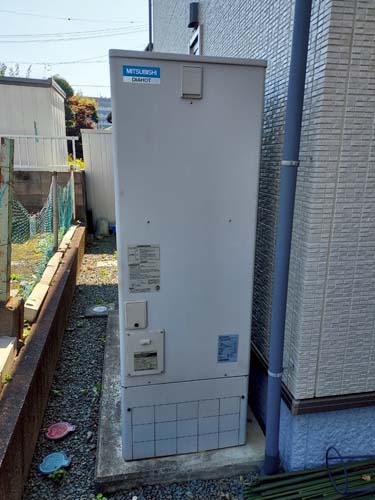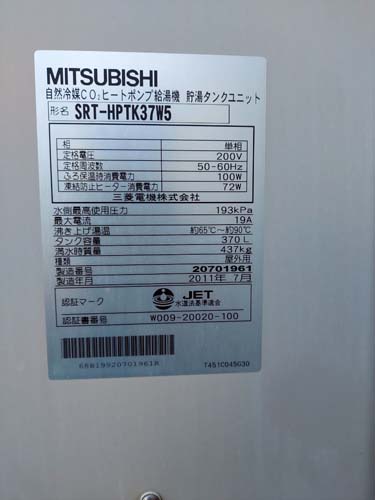 京都市下京区四条通 三菱電機自然冷媒CO2ヒートポンプ給湯機 貯湯タンクユニットSRT-HPTK37W5→パナソニック家庭用ヒートポンプ給湯機 ヒートポンプユニットHE-PLS45L エコキュート交換工事